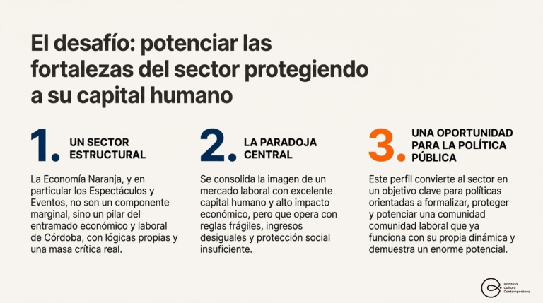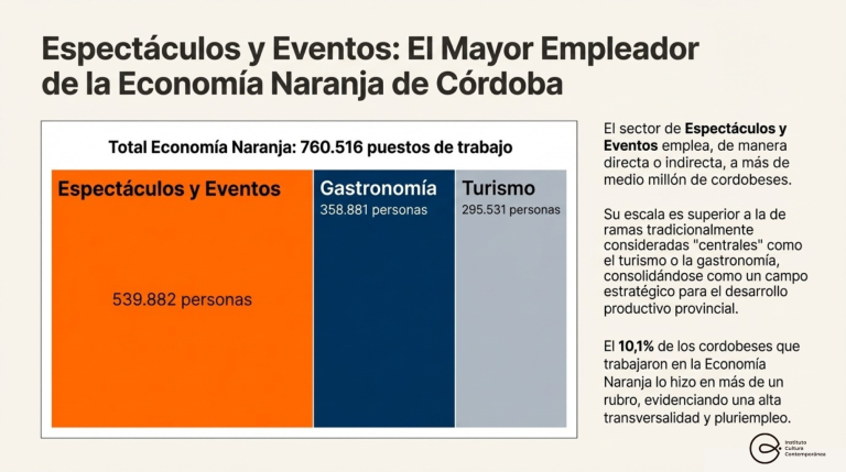 Para dimensionar estas cifras, el estudio comparó el empleo generado por distintos sectores: mientras Espectáculos y Eventos alcanza las 539.882 personas, Gastronomía emplea a 358.881 y Turismo a 295.531. “Estos números demuestran que la Economía Naranja no es un sector marginal o emergente, sino un componente estructural del entramado económico provincial”, señala el documento.