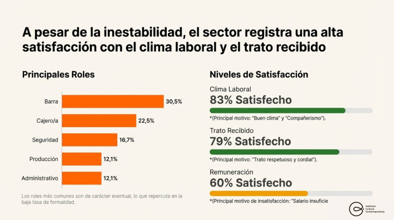 El perfil del trabajador de este sector es mayormente joven (46% tiene entre 18 y 29 años), con alto nivel educativo (55% posee estudios superiores), con baja protección social:  el 48% cuenta con cobertura médica. A pesar de esta coyuntura, el 83% de los trabajadores expresa satisfacción con el ambiente laboral, y el 60% se muestra conforme con la remuneración.